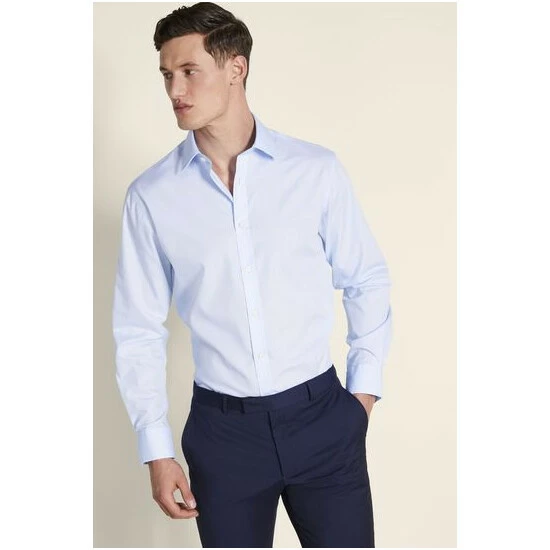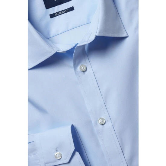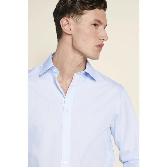 Crafted in a cotton blend with a tight poplin weave for crispness, it’s cut to a regular fit for strong lines that don’t swamp your frame but won’t sit too close, either.